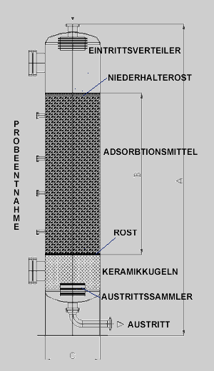 La unidad de adsorción es un recipiente cilíndrico vertical con un distribuidor de entrada, un captador de salida, una rejilla de sujeción, una rejilla separadora, el material de adsorción y bolas de cerámica como empaque inferior final.